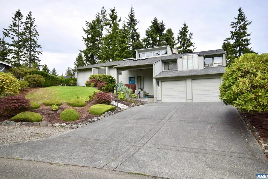 Stunning, contemporary house in Sunland, on premier lot with views of golf course, greenbelt & pond. Lots of windows for views & sun. Living room has vaulted fir ceiling with floor to ceiling fireplace. Fab kitchen updates. Two ensuite bedrooms. Primary bedroom has office space, walk-in closet, double wall closet, built-in dresser & private deck. Primary bath was completely remodeled with large walk-in shower, Thermo massage air jet tub, double sinks, heated floor & separate toilet. All rooms are oversized with lots of storage. Downstairs has rec room large enough for a pool table, with built in desk & shelves, & wood stove. Large laundry room & storage closet under stairs are also downstairs. Garage has Penntek flooring & golf cart door. Sunland offers beach lot on Jamestown Beach, beach cabana, RV parking, Tennis, Pickleball, clubhouse, pool, pool cafe. Beautiful golf course & fountain...