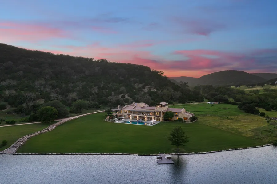 A scenic drive along the meandering live water Rocky Creek, past the ranch foreman's house and barn, leads you to a stunning architectural masterpiece designed by renowned firm Overland Partners. This 9,744-square-foot estate overlooks a tranquil 10-acre lake, seamlessly blending rustic Hill Country charm with modern elegance. Large panoramic windows in every room showcase the breathtaking vistas, inviting the surrounding landscape to become an integral part of your daily life.