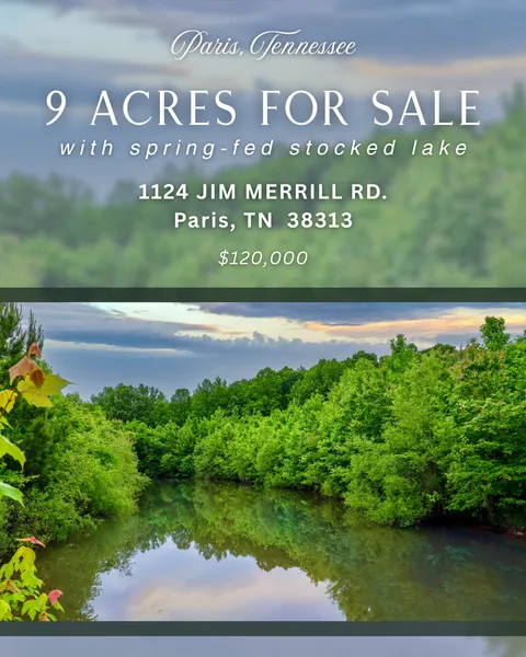 Escape to the country with this rare 9 ACRE gem in Henry County, Tennessee! ?? Just outside the city limits of Paris, TN, this beautiful property features a stocked 1-acre lake with its own island ???perfect for fishing, relaxing, and watching the wildlife. Deer, Turkey, & Canadian Geese; all frequent guests on the property!