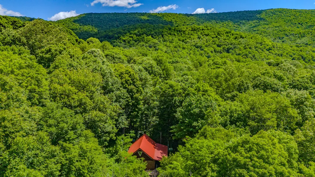 This Red Cedar cabin named Soaring Leaf is the epitome of a secluded retreat property. Originally built to be part of a cabin retreat resort this property now has over four and half acres to itself. Milled and built onsite, this sturdy home with cathedral ceilings and a stone fireplace is spirited away from the world surrounded by sun dappled forest sitting just above a trout stream. The home features an eight-foot covered sitting porch on the front, a wider star watching deck on the side, and a generous amount of interior living space.