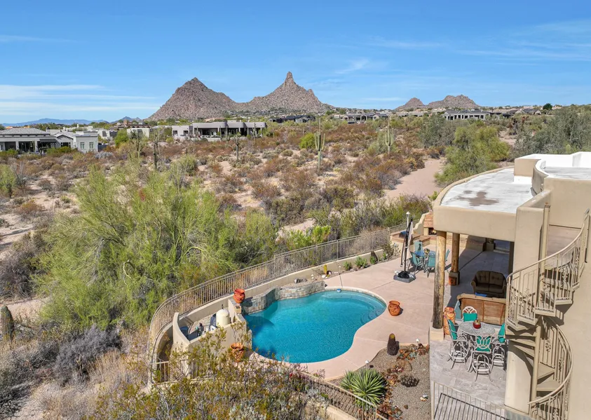 Discover your dream retreat in the gated community of Sonoran Highlands. This Southwestern contemporary home is nestled on a private cul-de-sac, offering unmatched privacy and serene living. Positioned on an East/West-facing lot that backs to open space, this property delivers breathtaking views of city lights, Pinnacle Peak, & the surrounding mountains, with an observation deck on the roof for even more spectacular vistas & views. The well-designed split floor plan features all ensuite bedrooms and a versatile office/den that can easily serve as a fourth bedroom with its own attached bath. The inviting great room layout is perfect for entertaining, highlighted by a fireplace, wet bar with sink & ice maker, & seamless indoor-outdoor flow from the wall of windows overlooking the backyard.