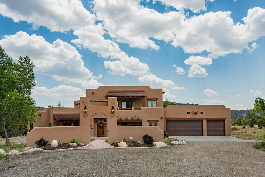 This warm and welcoming Santa Fe style home is surrounded by lush landscaping, gardens, and cozy alcoves and seating areas from where to enjoy it all. Perfect for the ultimate garden party. A few of the decks, including the pergola with the hot tub, overlook your Sanchez canyon - part of the nearly 15 acres included in this oasis. Spacious at 2820 sq ft, this home has 3 bedrooms, 2.5 baths, a living room, formal dining and a family room. Full of angles and curves and recessed art displays, there's architectural interest at every turn. The kitchen has new appliances, hickory cabinetry, a breakfast nook, and views of the canyon. It's open to both the family room and warm living room with its kiva-like fireplace. Each of the downstairs bedrooms has its own veranda, and the two are connected by a Jack n' Jill with double vanities. A graceful curved staircase leads to the huge Master Suite, with a sitting area, fireplace, desk/hobby space, two closets, a large bathroom with separate shower and soaking tub, and two decks, one on each side of the house. The 3-car garage and convenient circular driveway make parking a breeze, even with a crowd. Although it's not already set up for horses, this property easily could be as approximately 5 acres is flat and suitable for animals. A cute detached gardening shed and hot tub are included. Furnishings are negotiable. This is the Southwest at its best.
