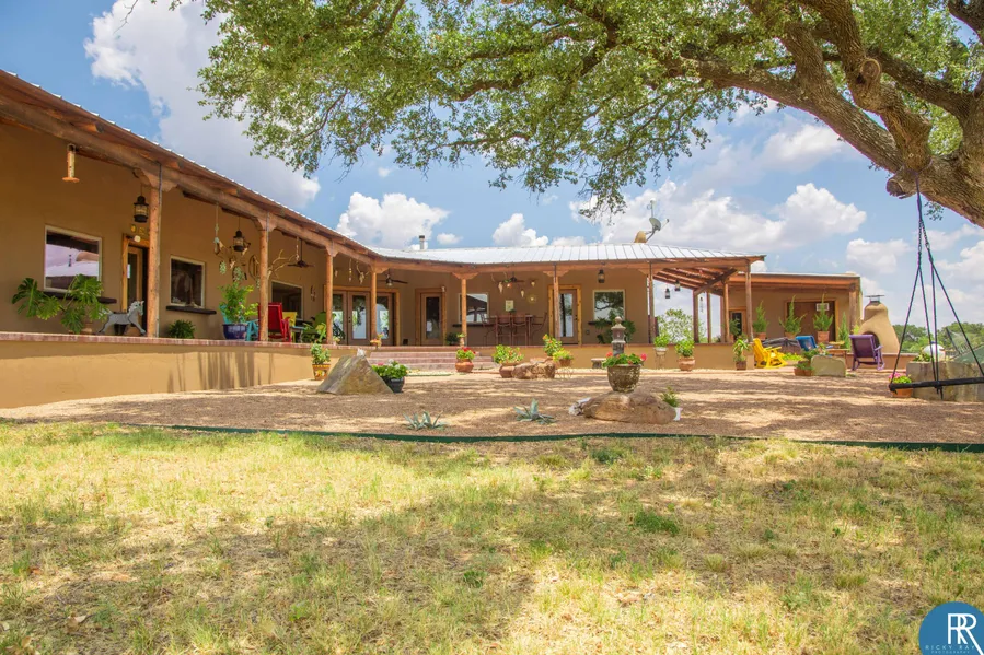 This Meticulously Maintained Southwestern Style Ranch Home is a Beautiful and Rare Find! Its unique architecture features smooth synthetic stucco walls, 2 Kiva Fireplaces, & immaculate landscaping. The large living area which flows seamlessly into the kitchen & dining rooms is the definition of open concept layout. The kitchen features an island, stainless steel appliances, & concrete counter tops. The master bedroom & bath are consistent with open concept design, sharing one large room with back porch access. The backyard is a relaxing retreat with an outdoor fireplace, water feature, large shady oak & a breathtaking view of the horizon. This phenomenal home and the 70+ acres make the perfect package deal.