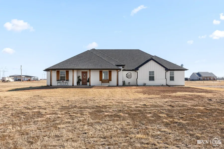 Room to roam and Holliday ISD in this 2022 custom home on 10.58 acres. Open floor plan with stained concrete flooring throughout.Pantry is also safe room, formal dining, isolated primary suite with large walk-in closet, separate shower and garden tub. Isolated utilityroom, amazing closet-space, large covered patio. Natural light floods each room. Super clean modern farmhouse style just 5 minutes toHolliday ISD.