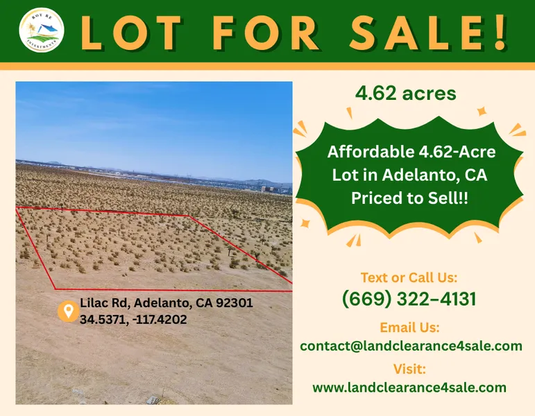 Looking for wide open space, starry skies, and freedom to build or invest? This expansive 4.62-acre lot in Adelanto gives you the perfect balance of privacy, desert beauty, and potential all without the restrictions of an HOA. Whether you're dreaming of a custom home, off-grid living, or a weekend retreat, this property offers the flexibility and size to make it happen. Enjoy the peace and quiet of the High Desert with room to roam, ride, and explore. The lot is ideally located near major highways yet tucked away enough to feel like your own private oasis. With few neighbors and big mountain views in every direction, it's the perfect place to unwind or build your next venture.