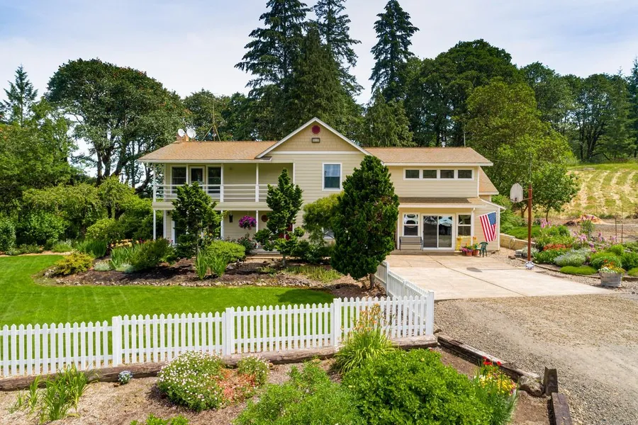Charming country estate on 5 acres! Gorgeous landscaping welcomes you home to spacious, bright interior. Flowing floor plan with master suite with sitting area, en suite and balcony overlooking landscaped yard. Plentiful room for entertaining, storage and craft/hobby use. Meticulous grounds boast two patios overlooking gardens, plumbing for hot tub and propane generator for home. 40'x 48' shop with covered pad, storage and livestock pen. Insulated 2nd shop with indoor/outdoor kennel. Two cross-fenced paddocks and replanted timber acreage.