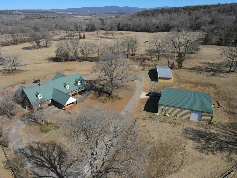 The beauty of this home and acreage begins from over a half mile away. The second you turn off the county road onto the private driveway, you can see the home in the distance, nestled into its gorgeous setting in the Ozark foothills. A gently rolling drive across the beautiful pasture ends inside the fenced lot of the home and shop buildings. Parking, equipment storage, space for pets, livestock, toys, friends, or family won’t be a problem with the circle drive, huge shop buildings, 2 carports, and even horse stalls. The home boasts a large kitchen with double ovens, and all 5 bedrooms are on the lower level. There is an enormous master bath suite and a large outdoor patio for entertaining or relaxing. Upstairs has 2 large dens and another full bath, creating the potential for a 6th bedroom. There is also a dedicated office on the main level.
