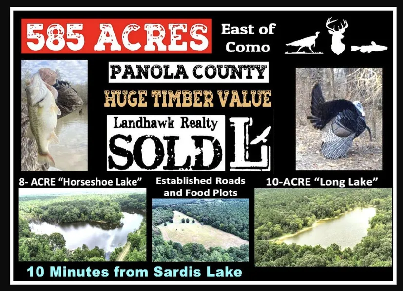 SOLD! Sportsman's Paradise!Located 10 miles east of Como & just 10 minutes from Sardis Lake, this property has it all. Loaded with deer and wild turkeys, the tract has big timber, established food plots, two stocked lakes, and a nice little cabin with two bedrooms and one bath. It also has over $10,000 in annual CRP income. All parts of the property can be accessed by the road system, which has been widened and vastly improved over the last year. New food plots have been made and limed, and both lakes have been restocked with black crappie. The property has over a half mile of frontage on Hwy 310. A complete timber appraisal was completed in the fall of 2020, and timber prices are steadily rising. The rustic 2BR 1BA cabin has a vaulted tin ceiling & an open den & kitchen space, plus an attached garage for storing your gear. The cabin has a private well, a private septic system, & fiber o...