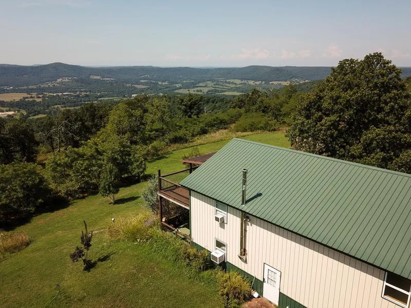 From which of the structures would you like an amazing view? How about all six? The 4 bedroom, 2 bath home has 2,500 square feet comprised of a spacious, open floor plan, high ceilings, and a large kitchen with two stove tops. The home is constructed as a metal building matching the four shops, and is built to withstand 100 mile per hour winds. The 1,150 square foot cedar log cabin is situated west of the main home, with its own established mailing address. Three shop buildings surround the cabin, and one shop building is paired with the main house on the east side. All structures are sensibly located and each one captures the incredible, approximately 180 degree view of the Osage Creek valley. As for the acreage, it is loaded with character. One established, stocked pond is conveniently located between the cabin and home, and the astonishing rock bluff formations are actually accessible...