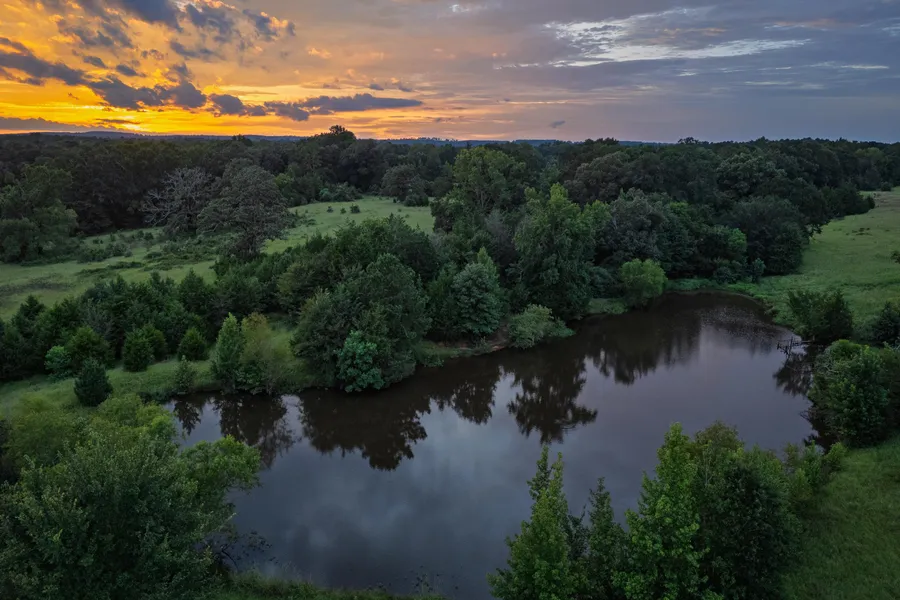The property is irregular in shape and features a blend of native pastureland interspersed with pockets of mature hardwoods and pine timber. Approximately 390 feet above sea level at its highest points, the land gently slopes downward to a low of roughly 330 feet, converging in the center of the property where Squirrel Creek and multiple feeder drainages flow. In addition to the year-round creek, a small pond just under an acre in size is located in the northern portion of the tract, offering water resources for wildlife or livestock.