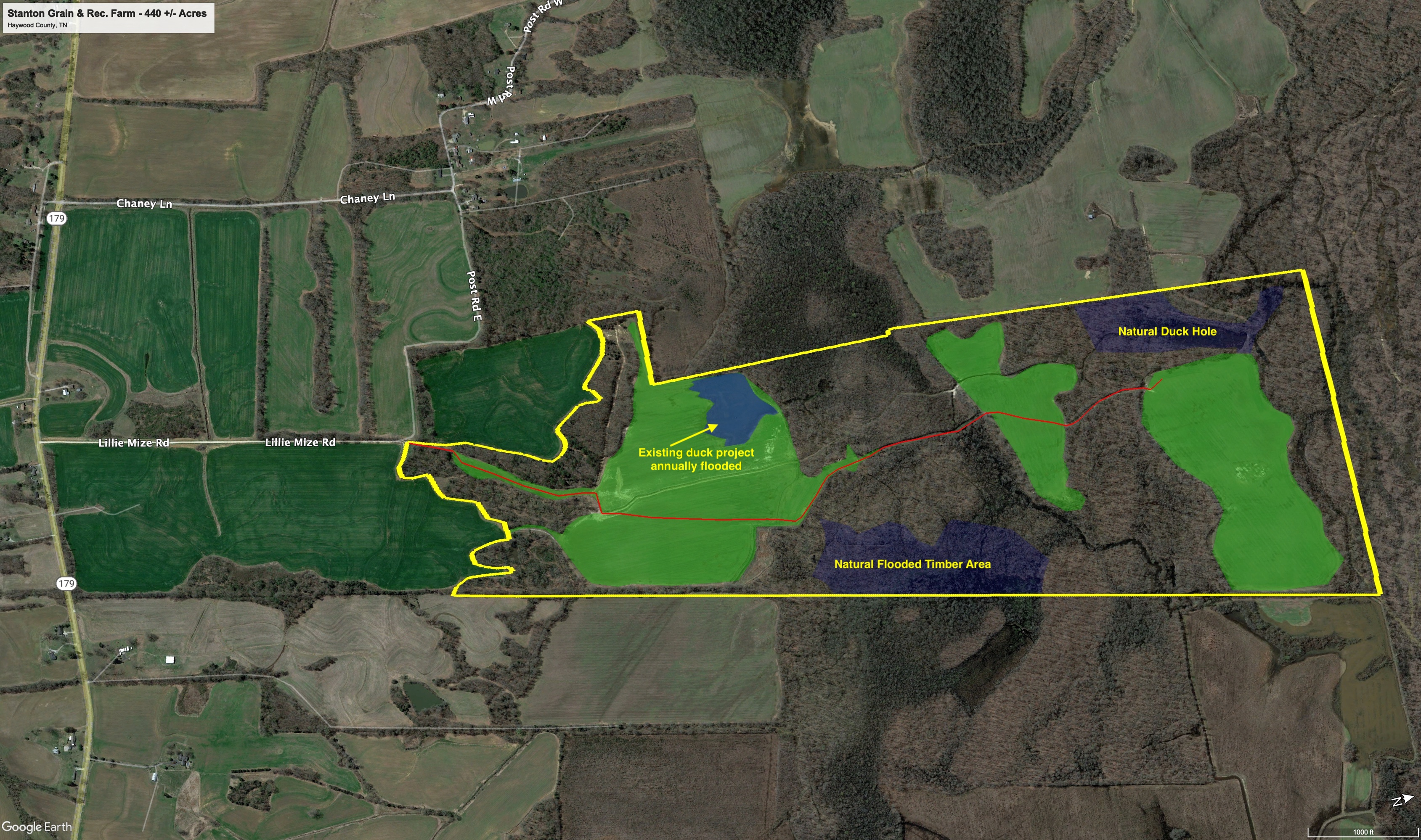The timber is primarily bottomland hardwood species consisting of White Oak, Red Oak, and various other species. There is merchantable hardwood timber that could be harvested today for income or allowed to continue to grow. Several areas of the timberland seasonally flood and can provide waterfowl hunting opportunities. Additionally, there are a couple deadening areas that have opened up where moist soil grasses are prolific making for excellent wintertime waterfowl habitat. Depending on your goals, it appears there are several other locations where you could further develop waterfowl habitat. The property is less than 1-mile from the Hatchie River channel and other neighboring properties annually flood waterfowl habitat.