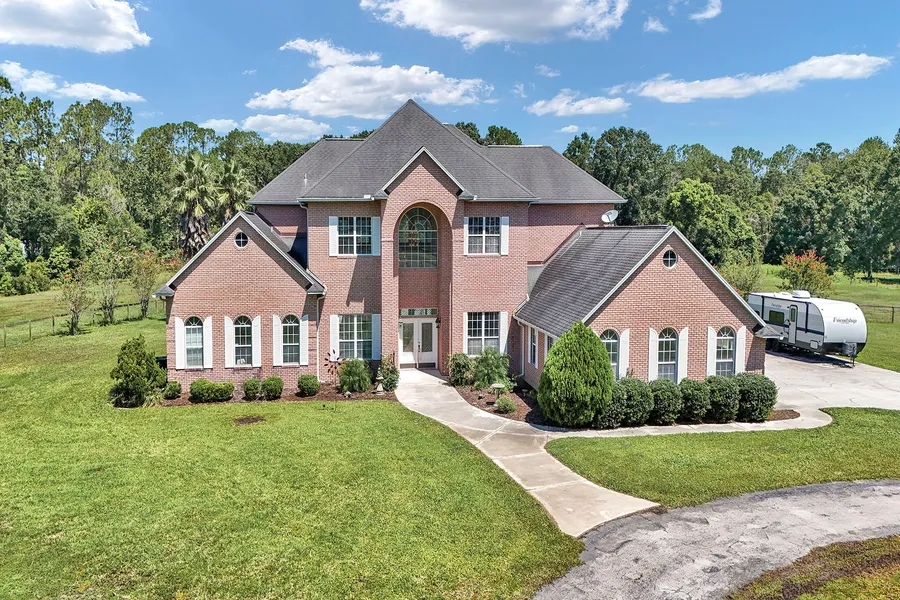 Under contract-accepting backup offers. On 23.85 acres of prime land, this stunning property seamlessly blends upscale living with exceptional equestrian amenities, all just under a mile from the heart of Starke. An equestrian lover's paradise, it features five meticulously fenced paddocks, a six-stall center-aisle barn complete with automatic waterers, rubber mats and rubber brick pavers in the aisle for easy maintenance. Whether you're training or riding, the regulation-sized covered dressage arena is ready for year-round use. And for those with a fondness for farm life, there's a charming chicken coop and a space for cows and goats, with the added benefit of an AG exemption in place. At the center of this exquisite estate sits a custom-built 4,193-square-foot home with five spacious bedrooms and 4.5 baths. Inside, enjoy soaring ceilings, expansive windows and an open-concept design th...