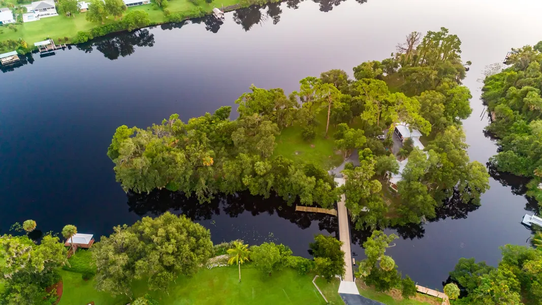 YOUR OWN PRIVATE ISLAND IN THE FORT DENAUD AREA OF SW FL! Located only 30 miles from downtown Fort Myers on the intracoastal waterway in the fresh water of LaBelle, FL, between two locks, making this a hurricane hole for boaters, or a private island retreat for those who love the unique and value their privacy! This tropical island has an unfinished Sanibel-style coach housea shell for you to complete to your own needs and taste. The current floor plan consists of a great room with kitchen, Florida room, office, laundry room, 2 baths, an oversized two vehicle garage and includes a roof top sun deck. The heavy duty construction is high quality frame with open beamed ceilings and decorative cupolas. The vacant roadfront old river home site is large enough for a second home, guest house, or a RV condominium with caretakers apartment; this lot features its own dock, decorative fencing, and a gated entry and asphalt paved driveway. The scenic bridge is steel and wood construction and boasts two docksone on each side of the oxbow. Enjoy unparalleled river views of both the old rivers native beauty and the new rivers boat traffic! FEED YOUR SOUL HEREBESIDE THE STILL WATERS!