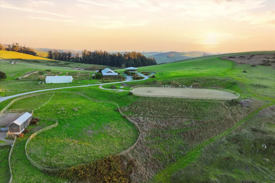 Spanning 113 gorgeous acres with sweeping panoramic views, this state-of-the-art equestrian facility in West Petaluma, offers an 8-stall barn with an office, high-speed internet, video monitoring, turn-out pastures, run-in shelters, and a 100' x 220' outdoor arena—ideal for top-level training.
