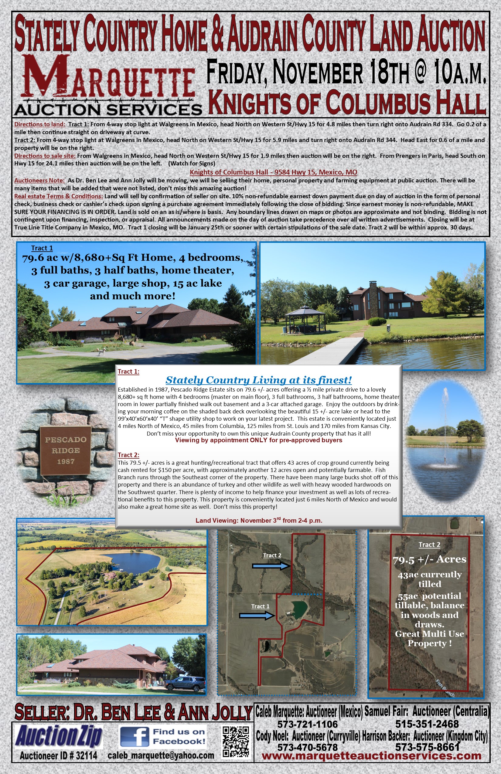 Real estate Terms & Conditions: Land will sell by confirmation of seller on site. 10% non-refundable earnest down payment due on day of auction in the form of personal check, business check or cashiers check upon signing a purchase agreement immediately following the close of bidding. Since earnest money is non-refundable, MAKE SURE YOUR FINANCING IS IN ORDER. Land is sold on an as is/where is basis. Any boundary lines drawn on maps or photos are approximate and not binding. Bidding is not contingent upon financing, inspection, or appraisal. All announcements made on the day of auction take precedence over all written advertisements. Closing will be at True Line Title Company in Mexico, MO. Tract 1 closing will be January 25th or sooner with certain stipulations of the sale date. Tract 2 will be within approx. 30 days.