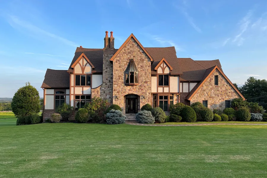 This custom-built Tudor home offers the grandest of views and is filled with natural light, thanks to carefully placed windows and doors that maximize the breathtaking vistas from every angle. Its solid stone masonry was hand-selected by this home’s one and only owner, who meticulously designed and built it, choosing the location specifically for its unparalleled views. Upon entering, you're immediately greeted by large formal rooms. The living room includes one of two fireplaces. Adjacent to the living room, a library/home office offers a serene workspace with incredible vistas, making it an inspiring place to work or read. The dining room features a large walk-in bay with four long casement windows that flood the room with light. The kitchen’s heart is a long granite pull-up island with a cooktop with two downdrafts. There are also dual wall ovens and a paneled built-in refrigerator. B...