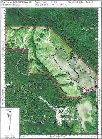The view from the top of the hill is beautiful! The growing long leaf pines are pleasing to the eye but also provide excellent bedding areas for deer. This section of Clay county has always supported great deer genetics and herd density and turkeys were here long before they populated the region. The camp ground has water and electricity. This tract is a home run for the ATV enthusiasts with trails all over!! This is a "must see " for outdoor fans! Call for a drive through! Priced at $2,250.00 per acre.