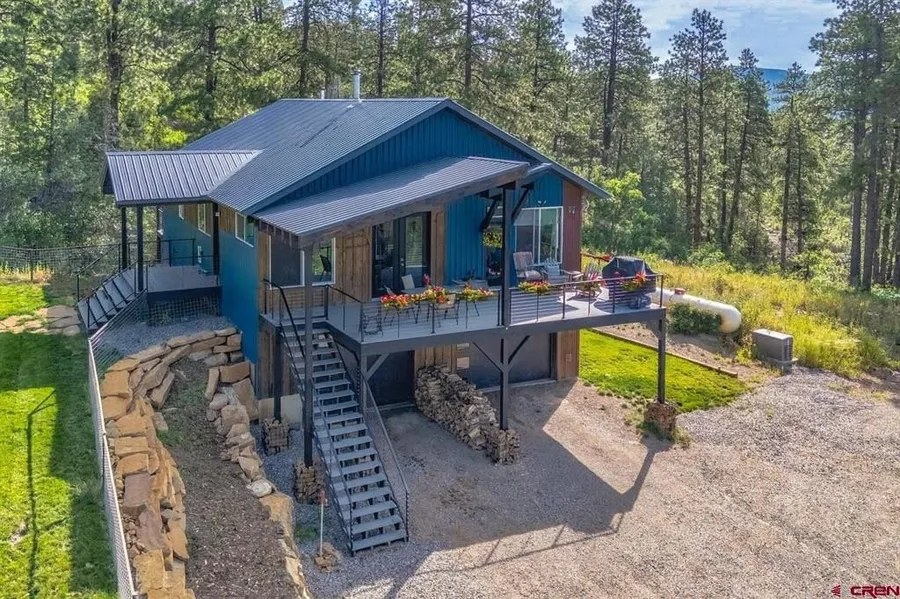 Gabi Bergstrom, RE/MAX Pinnacle, C: 970-946-7522, , Now offered at a compelling $1,550,000, a significant $90,000 price reduction for this irreplaceable 35-acre mountain-modern retreat just minutes from Downtown Durango. Nestled in the pines within a gated community, this 2020 Grandt Custom Home offers exceptional privacy along with stunning views of the town, City Reservoir, and surrounding mountain ridges. It is exceedingly rare to find a property of this size, quality, and location this close to town. Short-term rentals are allowed, and the land permits two additional residences, making it ideal as a private estate or strategic investment. This immaculately designed 2,234 SF home offers three bedrooms and three bathrooms. An oversized 846 SF acid-stained two-car garage connects to a lower-level living space that can function as a guest suite or in-law apartment, complete with its own kitchenette, bedroom, bathroom, walk-in closet, and full laundry. Over 600 square feet of covered outdoor living is spread across three separate decks, perfect for soaking in the fresh mountain air and year-round views. Inside, the elegant living room features vaulted tongue-and-groove ceilings, warm teak hardwood floors, and a wood-burning stove that opens to a covered patio shared with the primary suite. The kitchen includes granite countertops, a stainless farmhouse sink, glass tile backsplash, pantry, limestone tile floors, stainless steel appliances, abundant prep space, and a built-in home office. Whether gathered at the breakfast bar or in the adjacent dining area, this home is designed for everyday comfort and year-round entertaining. The main-level primary suite includes private deck access, a walk-in closet, and teak hardwood floors. Its spa-like bath offers dual glass vessel sinks, granite counters, an oversized shower with dual heads, a jetted tub, and two picture windows framing nature. A second en-suite bedroom sits quietly behind the kitchen, also with a walk-in closet and full bath. Behind the kitchen, the laundry room includes a utility sink, cabinetry, and a Samsung stackable washer/dryer with access to a second covered deck. The lower level beyond the garage and guest suite features stained concrete floors and opens to the third outdoor living space. Additional highlights: reverse osmosis system, whole-house water treatment, high-producing 30+ GPM well permitted for three homes, septic for five bedrooms, RV site with electrical pedestal 100 feet from the home, whole-house backup generator, and two-zone forced-air heating. A fully fenced grassy yard is ideal for pets and kids, and a seasonal ravine adds natural ambiance. A newly built, nature-immersed home with minimal HOA and unmatched proximity to Durango is truly a rare find at this new price.