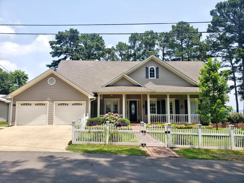 Nestled amidst the beauty of Lake Palestine, near Tyler, Texas, lies a picturesque waterfront retreat that embodies the epitome of lakeside living. A white picket fence surrounds the front yard, with a brick sidewalk leading to the front of this charming abode. Built in 2003 for the developer of Sunny Bay and Brown's Landing, this classic design seamlessly harmonizes with its natural surroundings. This 3 bedroom, 2 bath home lives large with 2215 sq. ft. surrounded by windows that span the lakeside providing stunning views. Open living, dining, & kitchen boasts a 2 story wall of windows with vaulted wood beamed ceiling and a beautiful 2 sided wood burning stone fireplace. Sunroom/family room has sliding windows that open to create screened porch if desired. Primary bedroom & bath on one side of home with two guest bedrooms & bath opposite. Tile and herringbone faux wood tile flooring thr...