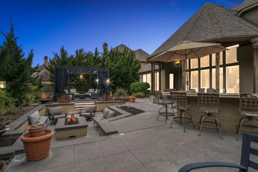 Exceptional TOP OF THE LINE home in Jenks Schools, Gated neighborhood. This SMART HOME is a step above the rest featuring occupied/vacant lit door handle in guest bath, app controlled; int & ext lights, home audio, blinds, firepit & home security. Theater Room w/ sink & fridge, Backyard w/ OUTDOOR LIVING & KITCHEN, large firepit (sunken firepit could be converted to in-ground pool), 2 Pergolas & a bamboo covered patio ceiling. 2 Beds, Office & formal Dining down. This home boasts a HUGE list of upgrades!
