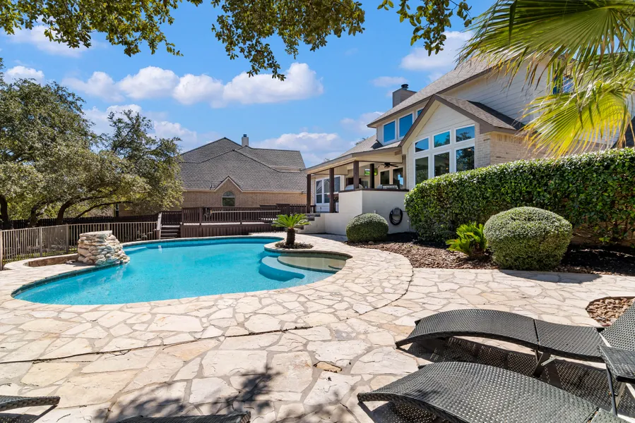 Absolutely stunning completely renovated home with a pool covering over a half an acre lot. Lovely landscaped lot full of charm and personality. As you walk into this two-story foyer this grandiose floor plan provides 2 spacious living areas, 2 dining areas, a private office space and much more. The Texas sized eat-in kitchen boasts a spacious breakfast bar, a kitchen island, pantry, and numerous built in high efficiency appliances. The spacious family room with an impressive fireplace creates a cozy atmosphere. Impressive tray ceilings line the primary bedroom while the luxurious updated ensuite spa-like bath comes with separate vanities, garden tub and an impressive walk-in closet. The ample office is available on the first floor. Upstairs offers three more secondary bedrooms that have easy access to a huge game room. Your private oasis awaits with its own inground swimming pool/water feature sharing a spacious covered patio/outdoor kitchen. Mature trees surround this property. This gated community is conveniently located inside San Antonio city limits and close to numerous local amenities like The Rim shopping center, Dominion Country Club, Camp Bullis, grocery stores and more.