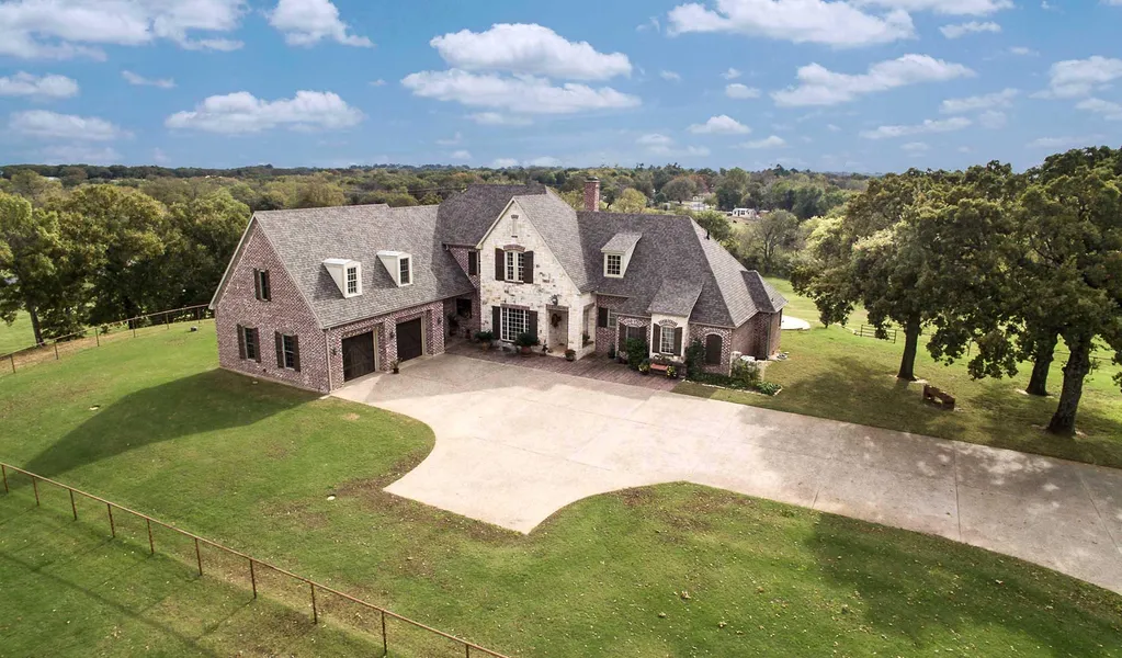 This eye-catching 15.5-acre estate offers a striking brick & stone custom home and in-ground pool in an elevated setting overlooking a scenic fenced pasture with scattered oak trees and a stocked pond.