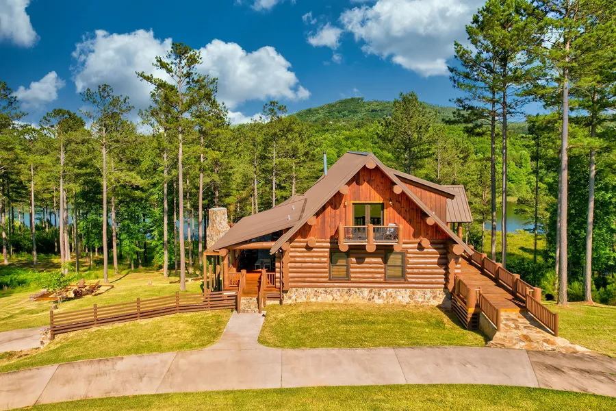 This stunning Lakefront Lodge is a truly luxurious retreat designed for comfort and relaxation in the beautiful Blue Ridge Mountains. The Big E-Log custom-built cabin offers a picturesque setting on 3.67+/- acres with views of Lake Nottely and the surrounding mountains, including over 220 feet of (seasonal) lake-front access and a single slip boat dock. Located in the desirable North Shore gated community, residents have access to a sand beach, community boat dock, and BBQ area with an outdoor fireplace at the water's edge. Short-term rentals are allowed with some restrictions, making this property a great investment opportunity. Inside, the furnished cabin features vaulted tongue and groove ceilings, hand-carved pillars, oak floors and beautifully appointed upscale finishes throughout. The expansive wall of windows perfectly frames the surrounding beauty. The living room is anchored by ...