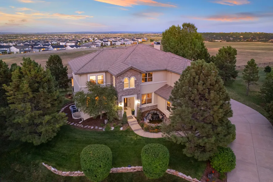 Located steps away from Gate 5 in the private, coveted Village at Castle Pines community, this well-appointed 5 bedroom | 5 bathroom residence offers stunning sunrise views, thoughtfully designed spaces, and immediate access to exceptional community amenities. The heart of the home, an open concept great room showcases soaring ceilings, double-height windows overlooking a large back yard, and a floor-to-ceiling stone fireplace. The adjacent kitchen features a Wolf six-burner gas range and hood, granite counters, stainless steel appliances, and outdoor access to a lovely deck - perfect for morning coffee under the color-strewn sky. Hardwood floors are found throughout the main level, and enhance the formal dining room and front living room. Further, an office with French doors and built-in cabinets offers a quiet, refined workspace. Additional rooms found on the spacious main level include a powder bathroom, convenient laundry | mud room, and 3-car garage with epoxy floor and built-in storage. Upstairs, the huge primary bedroom with sitting area is enhanced by a tray ceiling and coveted mountain views, and is paired with a sizable primary bathroom and closet. Three additional bedrooms with walk-in closets are complemented by two full bathrooms, one shared and one en suite. A loft-style workspace adds functionality and completes the upper level. Moving to the lower level, high ceilings give the finished basement an open feel, highlighted by a large game room with built-in cabinets, wet bar. Additional spaces include a wine closet, workout room, basement bedroom, and bathroom with a glass-enclosed shower and bench. With mature landscaping, sizable patio, fire pit, hot tub, a front water feature, and located a short 5-minute walk to The Summit Club pool | park complex and the Country Club at Castle Pines, this elegant home offers a perfect palette for your entry into the neighborhood and is surrounded by natural beauty at every turn.