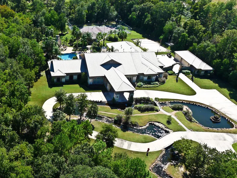 9,295 SF estate home w several ponds, long private drive, porte cochere, 4 car garage, 5 beds, 5 full, 2 half baths, Pool w waterfall, cabana w bath, outdoor kitchen & freestanding fireplace, palapa, private tennis, sand volleyball, billiards, table tennis, exercise & 2 media rms. 653 sf upstairs storage.
