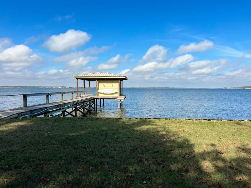 Stunning waterfrontage-wide open water! This Lakeside Village listing is a 3-bedroom 2 bath spacious double wide manufactured home. It has covered front and back porches inviting you to enjoy the quiet lake life. Inside is a an eat in kitchen with island; living room with electric fireplace; spacious bedrooms, perfect for the whole family to gather. Walking off the back porch you will enjoy the gentle sloping lawn taking you to the Pier with a boathouse/lift and storage room. The waterfrontage is protected with a metal bulkhead.