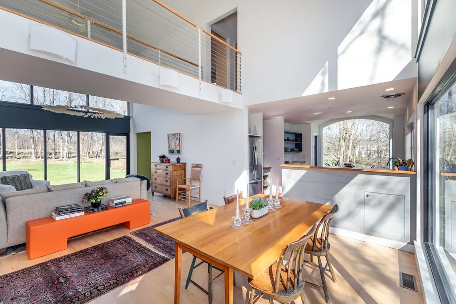 This amazing home is located in the quiet and historic section of Sharon known as Ellsworth. Built in 2000 and designed by noted local Architect Einar Lindholm, known for his Scandinavian influenced, modernest style. The home is filled with light from the expansive soaring windows, bringing the outside in. The main living area which encompasses the living and dining rooms has 2 story ceilings, maple floors and walls of windows. The kitchen is well laid out and open to the dining room on one side and a beautiful breakfast nook with large arched window on the other. A walk-in pantry and laundry room are off the kitchen, but privately tucked away. There is a den off the living room, perfect for a TV/media room. At the other end of the house is the primary suite with large walk-in closet, bath with soaking tub and separate shower and a generous bedroom with French doors. Upstairs are two bed...