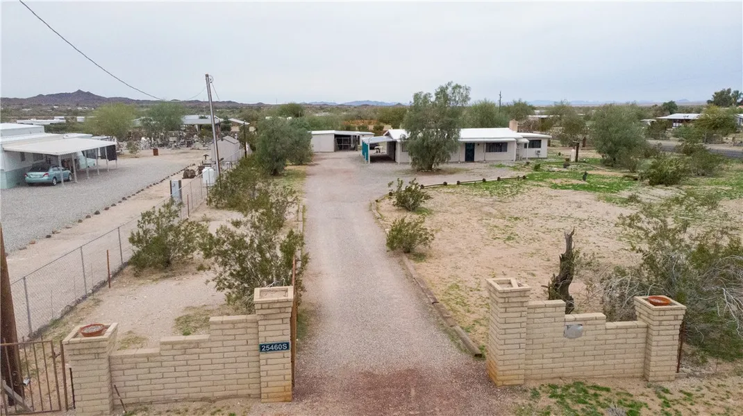 Welcome home to a charming retreat on a large corner lot less than 10 minutes from Parker, AZ. Exposed beams add character throughout, and the three bedroom layout is a great fit for a river getaway, full time living, or a solid investment. Inside you will find solid surface flooring and a spacious kitchen at the heart of the home that keeps everyone connected. The property is clean, well cared for, and ready to enjoy right away. Outside there is plenty of room for your toys with double gates for easy access, plus two outbuildings including a dedicated greenhouse for growing your own fruits and vegetables. There is also a separate workshop that feels like a small garage, complete with shelving and storage, perfect for projects and weekend gear. Call your agent for more information.