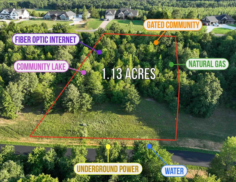 Gated wooded community with two entrances, underground power, water, natural gas and fiber optic internet. Community lake. Restricted to site built homes, 1850+ sq ft, no mandatory builder nor time to build.