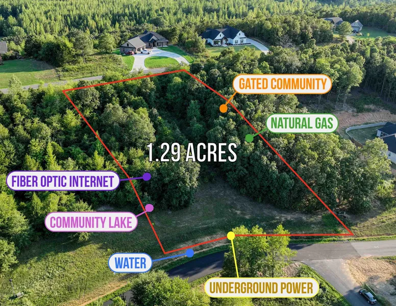 Gated wooded community with two entrances, underground power, water, natural gas and fiber optic internet. Community lake. Restricted to site built homes, 1850+ sq ft, no mandatory builder nor time to build.