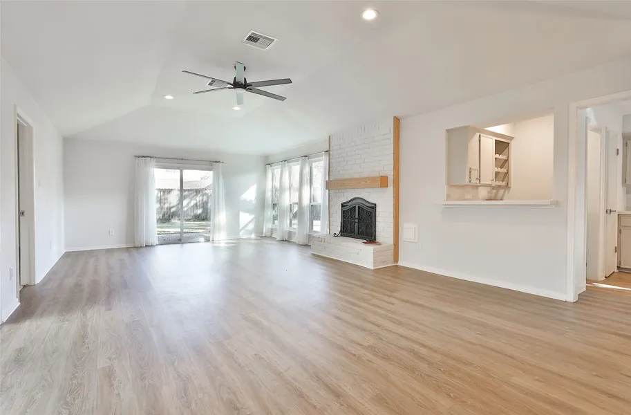 Stylishly professionally updated 3/2/2 contemporary one story home in the heart of Sugar Land. Plank flooring, quartz, stainless appliances, designer fixtures complement this modern home. Spacious family room with gas log fireplace and bar overlook the atrium. Modern kitchen with quartz counters, stainless appliances, gas cooking and dining room. Primary bedroom with en-suite bathroom with walk in shower, soaking tub, granite counters and modern fixtures and hardware. Great gardening or gathering area with an atrium and a large fenced back yard. Sugarmill has great community amenities; pickleball, pools, hike and bike trails, parks. A great location with easy access to 90A and 59. Local coffee shop, winery, Constellation Field, museums, churches nearby. Walk to elementary and middle school.