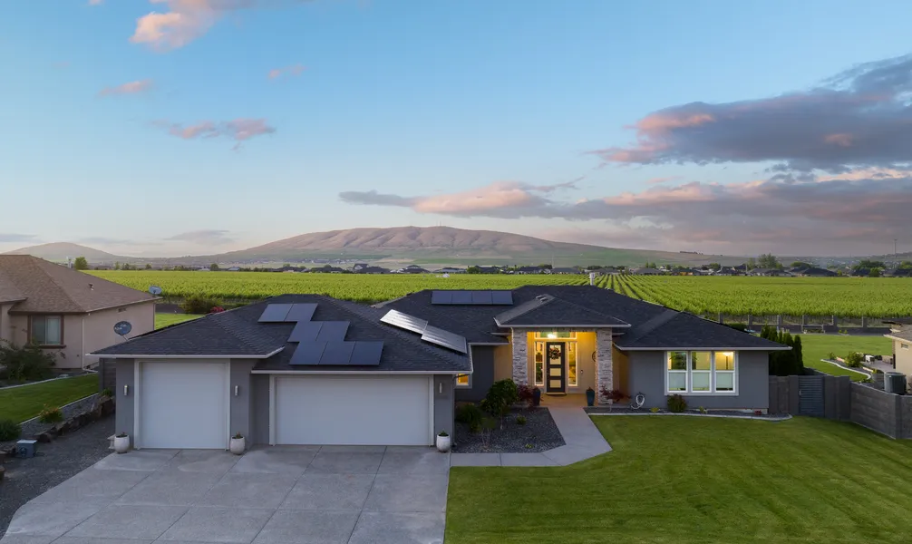 Nestled in the highly sought-after, West Kennewick, Summit View neighborhood. This like-new 2018 built home features upgrades that will elevate your lifestyle. As you enter this chic, zero-entry home, you're greeted by beautiful engineered hardwood floors and soaring 11' ceilings with color-changing lighting in the great room highlighting a beautiful linear fireplace with a sleek surround and mantle. The large windows offer a breathtaking scene of the professionally landscaped backyard which borders a Northern panorama of Eagle Butte Vineyard and territorial view of Badger Mountain. The sophisticated kitchen presents beautiful white cabinetry with double-stacked uppers featuring display glass, quartz countertops, gas range, stainless appliances, large island with extra storage, under-cabinet and toe-kick lighting, soft-close drawers, and walk-in pantry. Split bedroom concept delivers a Primary Suite on one side of the home with a walk-in fully-tiled shower, large walk-in closet, an oversized garden tub, and dual sinks with quartz tops. On the opposite side of the home resides three secondary bedrooms: the Junior Primary/Mother-in-Law Suite which provides an ensuite bathroom, a 3rdbedroom and oversized 4th bedroom/office/flex space with a large walk-in storage closet. The real show-stopper here is the breathtaking backyard amenities! A large covered patio that has been extended beautifully with pavers to appreciate the captivating backyard. When you're looking to retreat, there is a finished, insulated she-shed with climate control and electricity making it the perfect hide-out for peaceful reading. A large custom-built greenhouse with sprinkler system is a great place to cultivate your own hobby garden! Enjoy the convenience of operating your timed UGS from an app - with connection to Wi-Fi you may control it from your phone! Additional Features include Z-Wave technology allowing you to control the majority of lights remotely. Upgraded Lafayette top-down-bottom-up blinds throughout, a convenient utility sink in laundry room, pre-wiring for surround sound, AND an oversized 41' RV bay or 4 car garage with a man-door and rear pass-through garage door with opener. Halo installed on HVAC allows for reduced allergens, and Kinetico soft water system keeps hard water away, and Solar Panels offer energy efficiency. Proximity to the Country Mercantile, Gooseridge Winery, and Badger Mountain ensure the adventurer in you is never bored