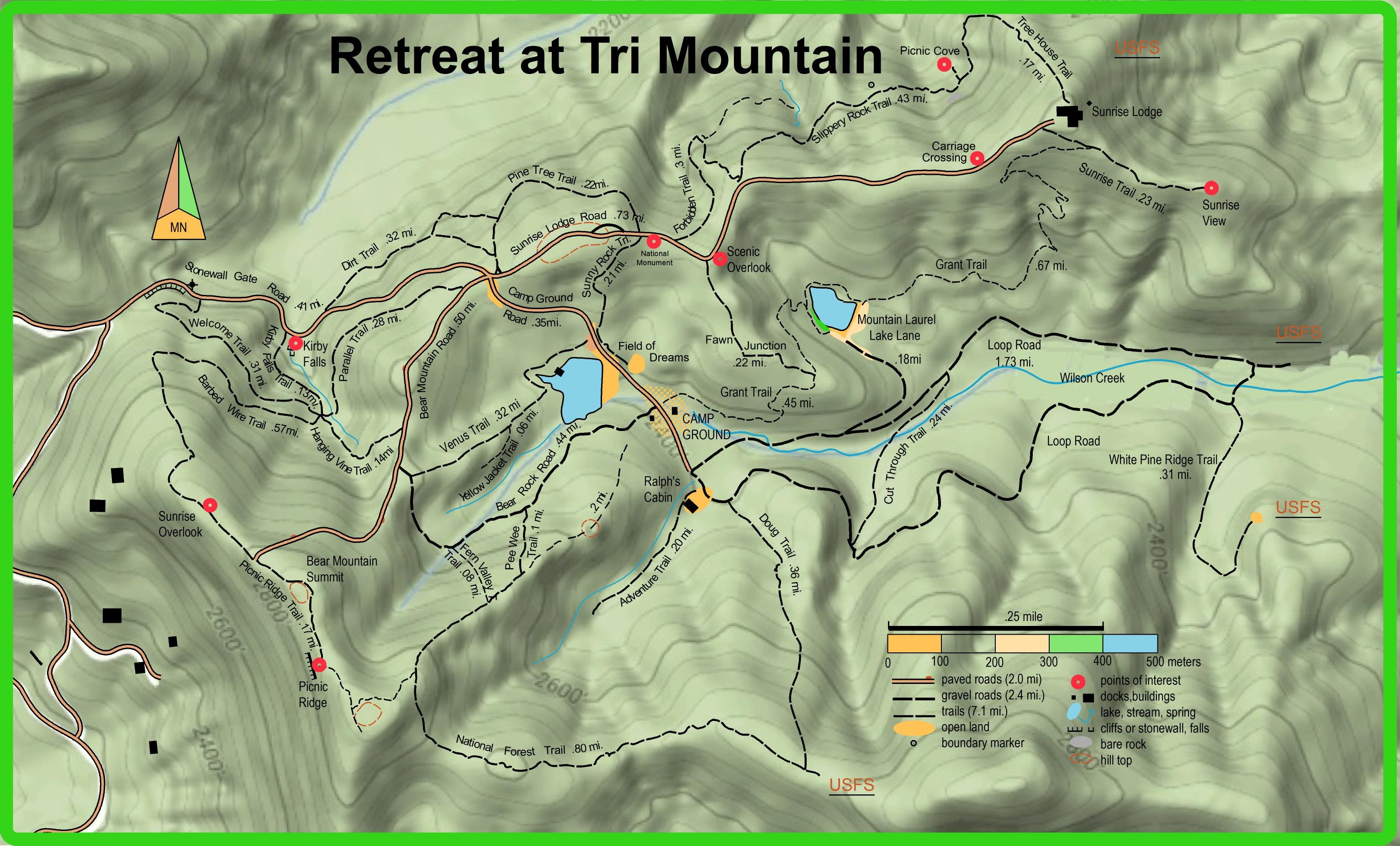 Sunrise Lodge is of course the crown jewel of Tri Mountain Retreat, but this property has so much more to offer with its over 448 acres of pristine wilderness, three (3) mountain tops including Bear Mountain, nearly three (3) miles of creek frontage along Wilson Creek and Kirby Creek, beautiful Kirby Falls, and two lakes. Explore your own personal nature preserve with over 12 miles of cut-in trails and roads (over two miles of paved roads), every trail mapped and named with high-end signage. This property is perfect for outdoor enthusiasts and those looking for a secluded wilderness paradise.