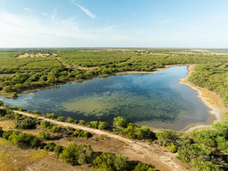 The topography of the ranch is gently sloping with a change in elevation from 55 to 20 above sea level, sloping towards an approximate 22-acre lake when full, near the middle of the ranch, it is also sloping towards Cayamon Creek, which is located just north of the property. The soils are clay to sandy loam, identified as Victoria and Aransas clay soil, along with Orelia, Miguel, and Willacy fine sandy loam, plus a small percentage of Raymondville Complex soil. The creek system and lake are part of a floodplain area that covers approximately half of the property. In this area just south of the creek is an approximate 40-acre improved grass pasture and the remainder of the property is mostly big trees and brush.