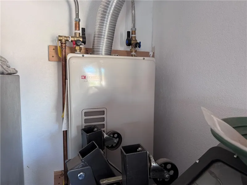 This 3 bedroom 3 bath home on an acre is zoned agricultural with plenty of space for horses, toys or the garage of your dreams. Acre is fenced with RV and human gates. Producing Peach-Pear and Pomegranate fruit trees and a your own Joshua Tree. Home has a standard living room with fireplace plus a huge recreation room with casual dining. Spacious bedrooms with plenty of closet space. Freshly painted interior. Many extras like new PEX water lines through out, new vinyl flooring, some new windows and a tank-less water heater. Choose electric or gas for your stove or dryer with dual hook ups. Even a gas hook up on covered back patio for BBQ. Two car garage has shelving, heating and cooling with a 1/2 bathroom just inside the human door to home. Two storage buildings in back yard. Seller installed a complete solar system about a year ago, seller will pay it off during escrow.