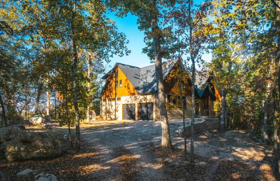 Rustic-Modern Luxury Retreat with Table Rock Lake Views Welcome to a stunning lakefront custom-built retreat where rustic lodge charm meets modern luxury. Completed in 2022 and set on a wooded 5.36-acre bluff, this exceptional home overlooks the peaceful side of Table Rock Lake with sweeping views and a private wooded path leading to the shoreline below. With 5 bedrooms, 5.5 baths, and more than 5,000 sq ft of beautifully designed living space, this home blends natural elementssoaring cathedral ceilings, warm wood finishes, and expansive windowswith clean modern lines and refined finishes. The gourmet kitchen shines with high-end appliances and custom granite throughout, opening into light-filled living and dining spaces anchored by a cozy stone fireplace. Step out to the screened-in porch to relax among the trees, or enjoy the lower-level game roomperfect for hosting family and friends. Each bedroom features its own private bathroom, and the main-level primary suite includes a spa-inspired bathroom with a luxurious rain shower. Additional features include a concrete safe room, oversized two-car garage, and dual-zone HVAC for year-round comfort. Outside, natural bluff-top seating offers a quiet place to unwind and take in the ever-changing landscape and seasonal lake views. Located minutes from Eagle Rock Marina and Holiday Island Marina, and within easy reach of Eureka Springs, Branson, and Northwest Arkansas, this private retreat delivers the ideal balance of nature, style, and convenience. Experience the serenity, style, and soul of true lake living of this rustic-modern Table Rock Lake sanctuary.