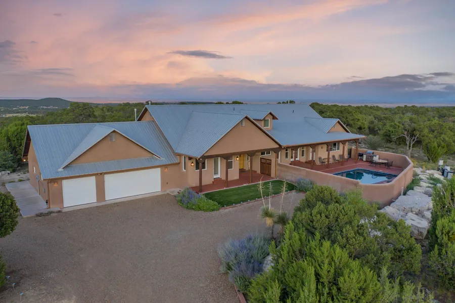 Looking to diversify your investment portfolio? Peace and privacy are yours at this historic property at the foothills of the Manzano Mountains. This fully furnished custom home features 367 fenced/cross-fenced acres of juniper, pinon and ponderosa pine. Double wall construction with vigas in vaulted ceilings, a wood-burning stone fireplace and reclaimed oak floors in the main living areas complement the granite countertops and hand-made cherry cabinetry throughout. Soak in the sparkling solar-heated saltwater pool with breathtaking views of the Manzanos with over 200,000+ acres of Cibola Nat'l Forest adjoining for private access to hiking, riding & hunting. Chef's kitchen with VIKING Pro stainless steel appliances, 3 car finished/heated oversized garage comes stocked with tractor, mule and trailer. Off-grid backup generator included. All furnishings convey. New Pool cover and automated ...