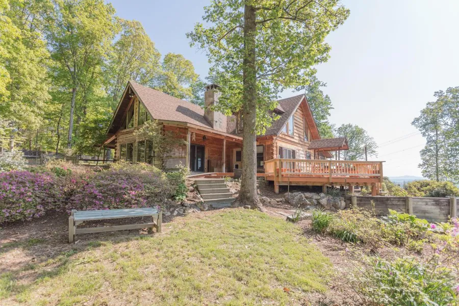 Escape to this custom built log cabin located on 17.70 acres. A combination of beautiful woodwork, stonework and custom details make this home one of a kind. Main level open floor plan offers living room with wood burning fireplace, open kitchen, large dining area, walk in utility and pantry area, sleeping room and large bath. Second floor hosts loft, two bedrooms and a full bath. Enjoy the mountain and farm views off the screened in porch or wrap around deck. Exceptional workspace in detached workshop, room over the garage and greenhouse. Tons of outdoor garden space, including various beds and fenced in spaces.