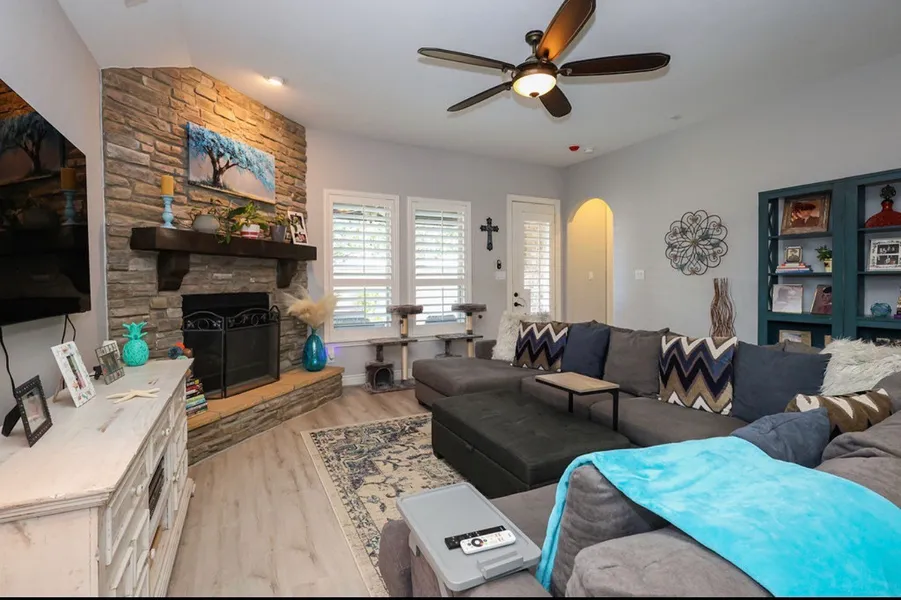 Welcome to your dream oasis! This fabulous 3-bedroom, 2.5 bathroom home boasts 2,268 sq. ft. of stylish living on a quiet cul-de-sac. So many thoughtful details and upgrades throughout including the upgraded mahogany glass door. High coffered ceilings!Updated wood floors & eight foot tall doors throughout! This home also features wooden shutters. Custom french doors opens to the study. A butlers pantry with granite countertops & custom 48 inch cabinets with a wine refrigerator!Don’t forget the gourmet kitchen equipped with all new stainless steel appliances. The home also features a bar height countertop that connects to the family room which also has a stone fireplace!The primary suite has his and & her custom vanities, a deep garden tub, an oversized shower & a walk in closet. Don’t forget the fenced backyard that was recently pressure washed, windows washed and the makeover that was done! That includes a covered patio, a fire pit and a paved dining area, perfect for entertaining.