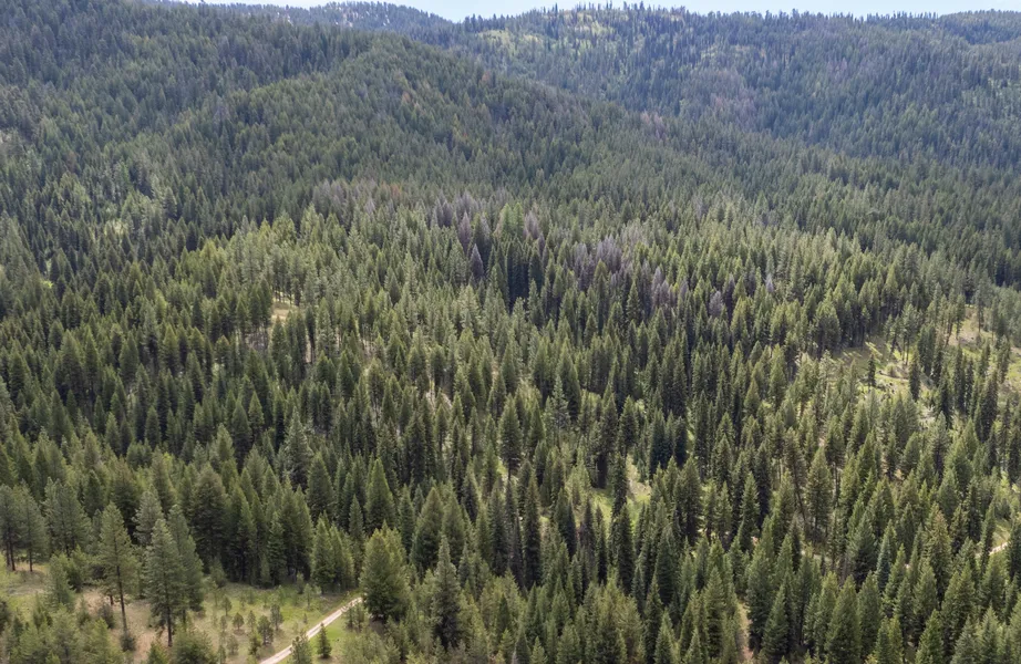 The lush green canopy of trees stretches as far as the eye can see, with a well-maintained dirt road winding through the landscape, providing easy access to various parts of the property. The forested area is ideal for hiking, wildlife observation, and enjoying the tranquility of the great outdoors. Additionally, the property borders Forest Service Land, giving this property a much larger feel and expanding your exploration and recreational opportunities.