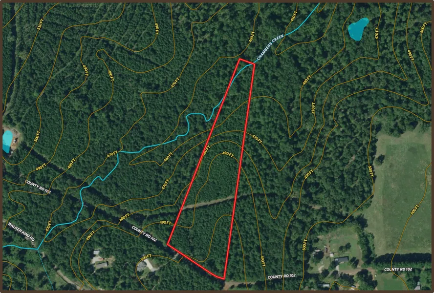 If youre looking for a small secluded place to get away thats still close to town, check out this neat little property. It has a nice mixture of hardwoods across the entire property that would serve well for hunting or recreation. There is an awesome terrain and elevation change on it as well with Chambers creek going across the back corner. If youre looking to build a secluded home, there is also a nice house place as well that allows you to get off the road for ultimate seclusion.