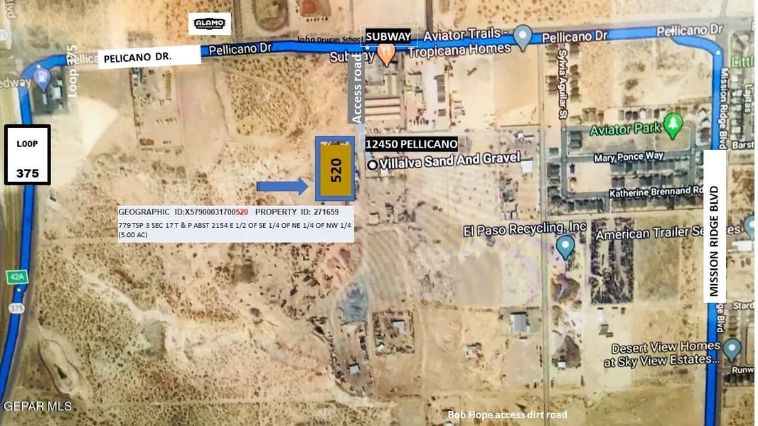 Located in the path of the fastest development corridor of east El Paso off Pellicano Dr., and within .6 mile to Loop 375 and very easy access to I-10. This 5 acre lot has no zoning restrictions and is ideal for any commercial use (warehouse, transportation/logistics, automotive shop, construction/landscaping yard, etc.). Located within 3.2 miles from the new Amazon Fulfillment Center. Seller financing considered with 250K down for 10 years .