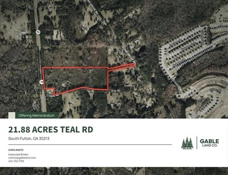 A branch of Pea Creek gracefully borders the eastern side of the property, adding natural beauty and appeal for single-family and recreational buyers. While the creek enhances marketability for end users, although it will require thoughtful planning to accommodate in future development layouts. Strategically located near a host of major amenities, the site is in close proximity to: Commercial retail centers, National distribution hubs, Rail access, and only 13 miles from Hartsfield-Jackson Atlanta International Airport, the world's busiest airport.