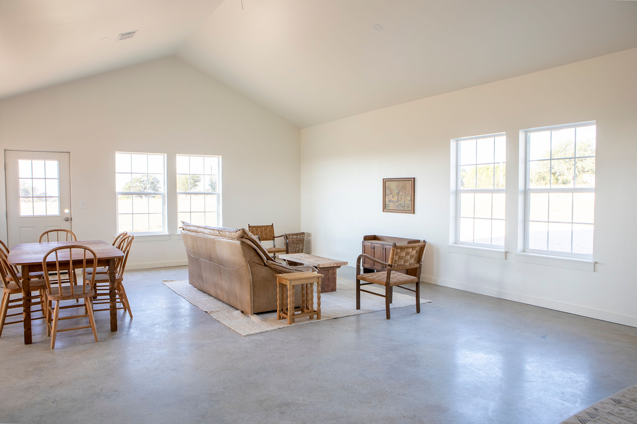 The Living Spaces: Oversized windows frame panoramic Hill Country views while flooding the interior with natural light. Polished concrete floors, shiplap accents, and curated lighting complete the home’s cohesive, high-end aesthetic.