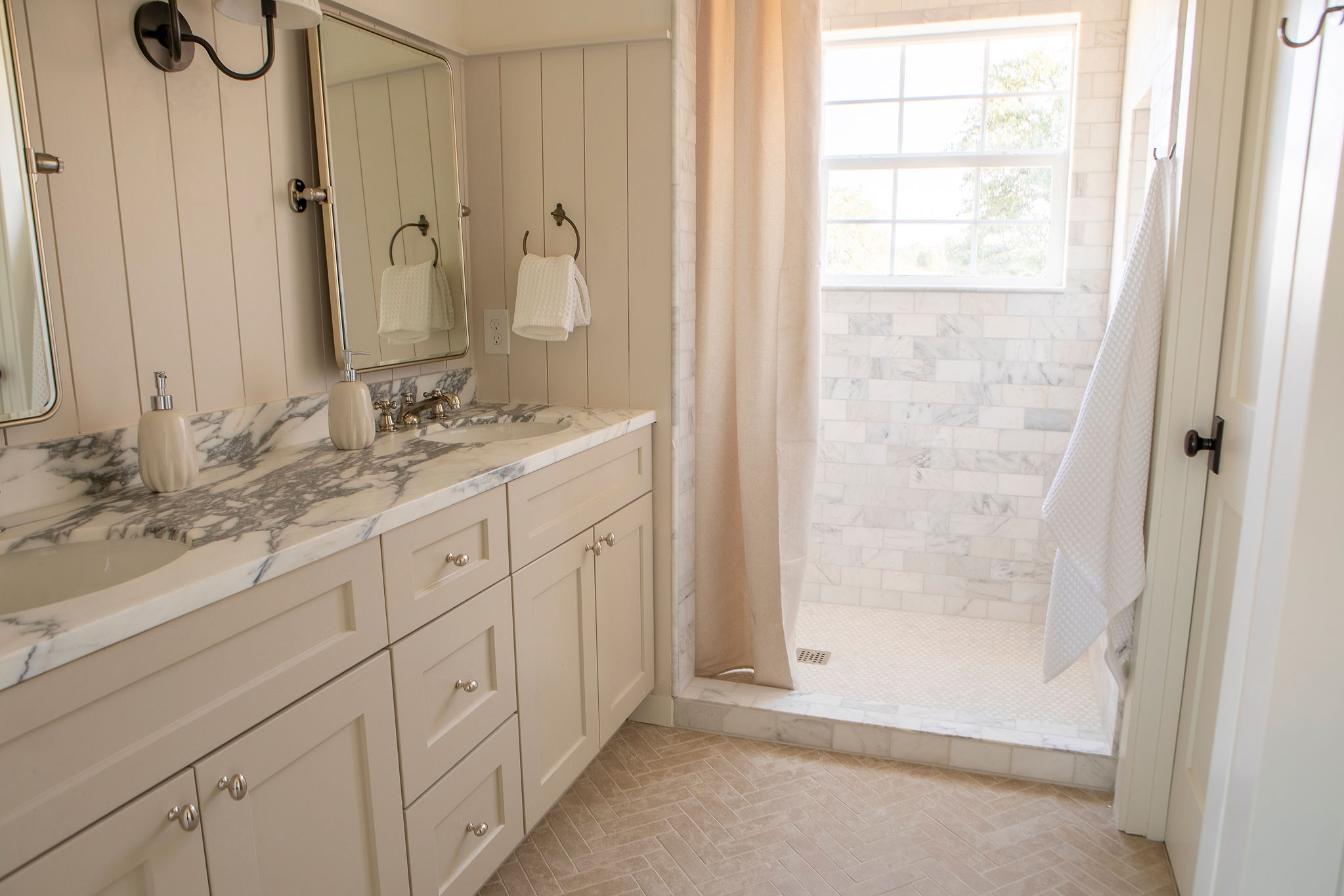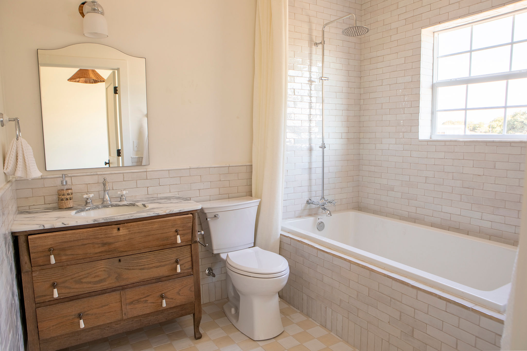 The Bathrooms: Thoughtfully designed sanctuaries with refined finishes. The primary suite includes a walk-in marble-tiled shower and dual marble-top vanity. The guest bath features a unique wood vanity, stylish tub-shower combination, and designer tilework.
