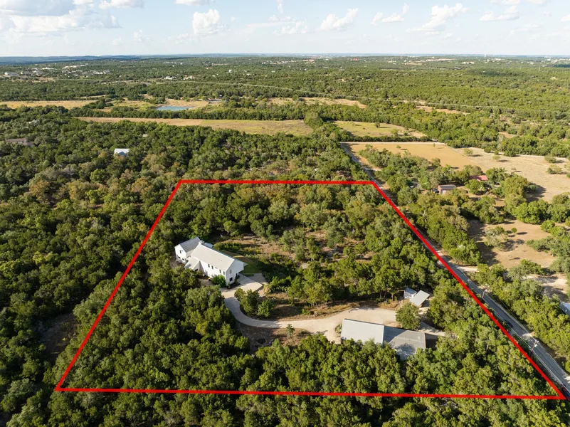 Welcome to a Texas ranchette of rare distinction, where modern architecture meets Hill Country serenity. Perched on 6 private acres with sweeping, unobstructed views, this architectural masterpiece offers the perfect balance of prestige and privacy. From the moment you step inside, soaring 30+ foot ceilings and walls of glass create a dramatic sense of space, yet the main house was purposefully designed so no direct sunrise or sunset light enters the windows, framing sunsets that feel like living art. Every detail, from the polished concrete floors to the bespoke finishes, has been carefully curated for a home that is as refined as it is livable. At its heart lies a chef’s kitchen designed to impress, anchored by a massive island, perfect for intimate family dinners or lively gatherings. Each bedroom is a sanctuary with its own en-suite bath, blending comfort and elegance with thoughtful privacy. Outside, the home transforms into a private resort: a sparkling in-ground pool and spa, fully equipped outdoor kitchen, and expansive entertaining terraces designed for evenings under the Texas sky. Meander along your own network of private walking trails, or simply unwind in the stillness of Hill Country sunsets stretching for miles. The property also features a custom 2,480 sq ft barn/shop, complete with a professional-grade lift built directly into the concrete floor, an incredible amenity for car enthusiasts, hobbyists, or those who desire versatile workspace. The barn also includes a partial kitchen and a full bathroom and the capacity to serve as a 4-car garage. Additional bonuses include dual electric car charging stations and an unrivaled sense of tranquility just minutes from Austin’s cultural heartbeat. This is more than a getaway, it is a statement of artistry, luxury, and lifestyle.